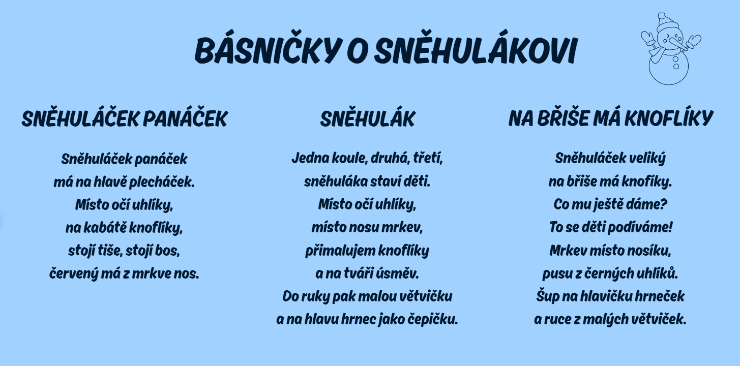 Když napadne první sníh, tak většina dětí chce hned stavit sněhuláka. Stačí pár koulí, hrnec na hlavu, mrkev místo nosu a je to! A protože sněhuláci patří k zimě stejně jako zmrzlé a červené nosy, připravili jsme pro vás tři veselé básničky o sněhulákovi.
