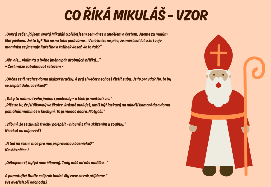 „Dobrý večer, já jsem svatý Mikuláš a přišel jsem sem dnes s andělem a čertem. Jdeme za malým Matyáškem. Jsi to ty? Tak se na tebe podíváme… V mé knize se píše, že máš šest let a že tvoje maminka se jmenuje Kateřina a tatínek Josef. Je to tak?“