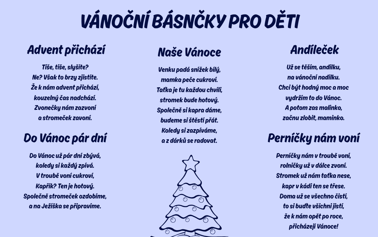 Vánoce už jsou za rohem! Doma voní cukroví, v obchodech jsou slyšet koledy a všichni se těší na zdobení stromečku a dárky. Vybrali jsme pro vás osm vánočních básniček, které si můžete přečíst, naučit v rámci besídky ve škole, nebo třeba použít na přáníčko pro babičku, maminku a tatínka.